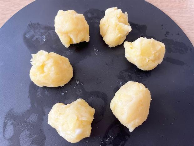 2. じゃがいもが熱いうちにつぶし、[A]を加えてよく混ぜる。混ざったら6等分にする。