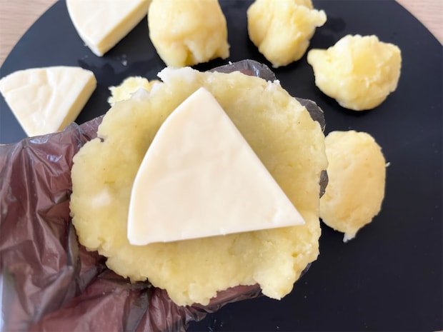 3. 2の生地を丸く広げ、6Pチーズを包む。全体に片栗粉をまぶす。