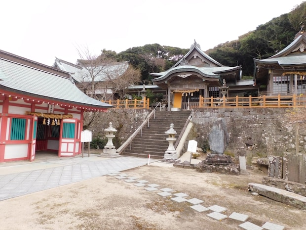 呼子から呼子大橋で結ばれた加部島に鎮座するお社で、弁財天のモデルと言われる「佐用姫」をお祀りしており、五穀豊穣や交通安全などにご利益があるとされています。