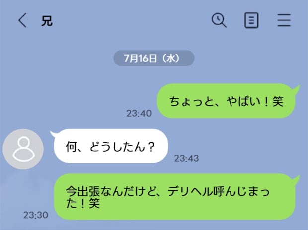出張中のパートナーが、仕事以外で何をして過ごしているか気になる人もいるでしょう。この記事では、夫が出張中に風俗を呼んでいたことが発覚したという投稿を紹介します。何かの勘が働いて夫が義兄に送ったLINEを見た投稿者さん。はじめはとぼけていた夫ですが、LINEのやり取りを見たと話すと…。