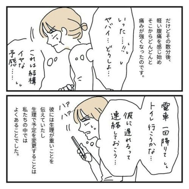 生理痛がいつもひどくなりがちなキクチさんですが、まだ1日目だし、生理痛もそんなにひどくはならないだろうと思い彼とのデートに出掛けます。しかし電車の中で腹痛は急にひどくなり、急いで帰宅。