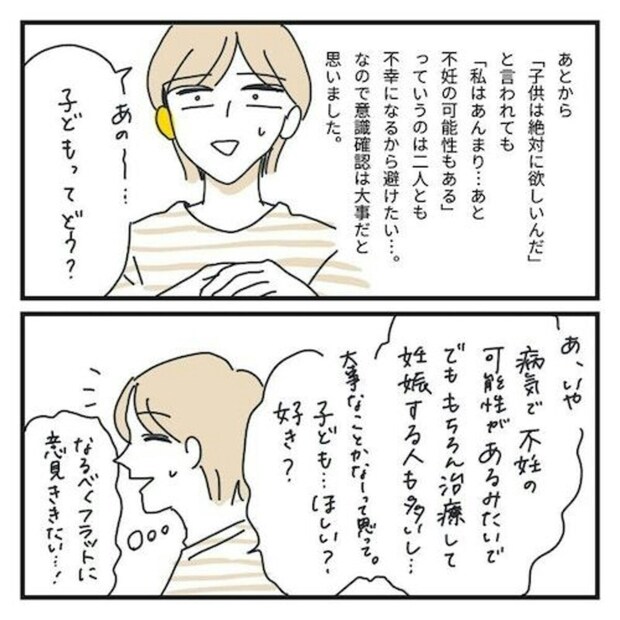 まだ結婚の話があるわけでもないのに気が早いだろうか…でも結婚したくなってから子どもは産めない可能性があるかもとは言いにくいのではないだろうか…きちんと話し、子どもを持ちたいと思っているか…などについても率直な意見を聞いてみることに。