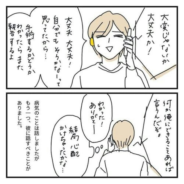 手術の可能性も含めて治療が始まりますが、いつも自分のこと以上に心配してくれる彼の負担になりたくなくて、報告をためらいます。