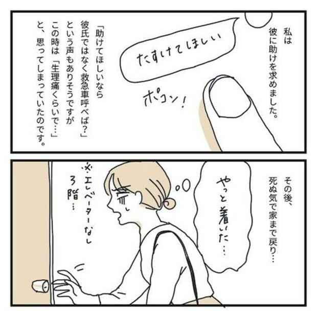 事情を連絡したら、彼がお昼ご飯を届けてくれ、その日はゆっくり休むことにしました。後日受けた会社の健康診断で、強い生理痛の原因は子宮内膜症・子宮腺筋症だと判明します。