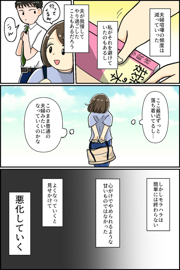 夫のモラハラがエスカレートし、うつ状態に陥ってしまった主人公。しかし、心療内科を受診したのをきっかけに、夫のモラハラは影を潜めます。このまま平穏な日々を取り戻せると思っていましたが、再びモラハラが再燃。