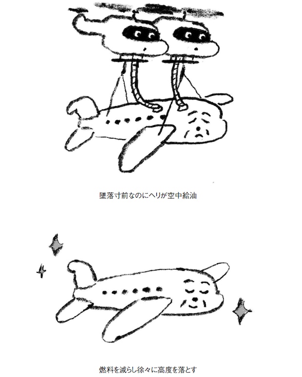 飛行機が、徐々に高度が下がってきてしまったとします。すると「危ない、これは燃料が足りないからだ」という理屈で、落下しないようヘリに吊られて、空中給油が始まる。