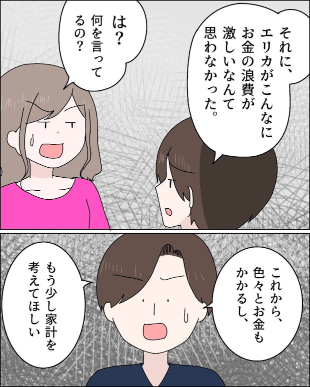 「それに、エリカがこんなにお金の浪費が激しいなんて思わなかった」ケイさんの言葉に、「は?何を言ってるの?」とエリカさんが言い返すと、「これから、色々とお金もかかるし、もう少し家計を考えてほしい」ケイさんがそう訴えると、