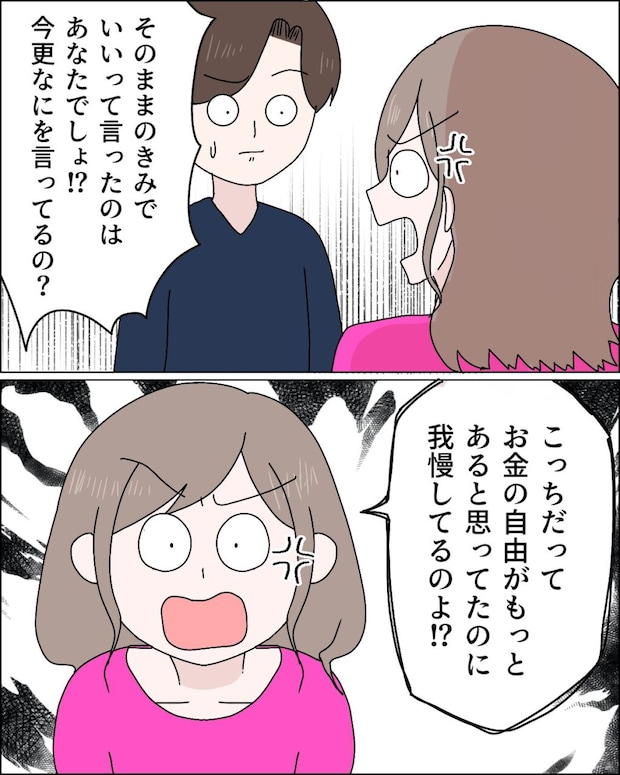 すると、「そのままの君でいいって言ったのはあなたでしょ!?今更なにを言ってるの?」とエリカさんは怒り出し、「こっちだって、お金の自由がもっとあると思ってたのに我慢してるのよ!?」とこれまで我慢してきたことをケイさんにぶつけました。