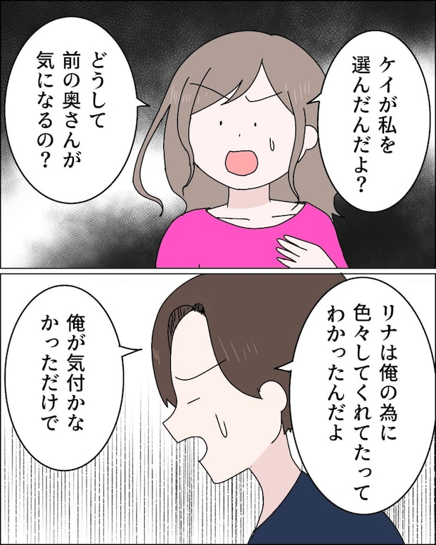 「ケイが私を選んだんだよ?どうして前の奥さんが気になるの?」とたずねると、「リナは俺の為に色々してくれてたってわかったんだよ。俺が気づかなかっただけで」と切り出すケイさん。