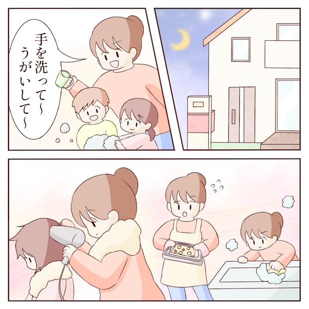 帰宅後は、まずは手洗い、うがい。子ども達と洗面所に直行し「手を洗って~。うがいして~」と促します。その後は一息つく間もなくお風呂とご飯の準備。それが終わったら子ども達の髪を乾かして寝る準備です。