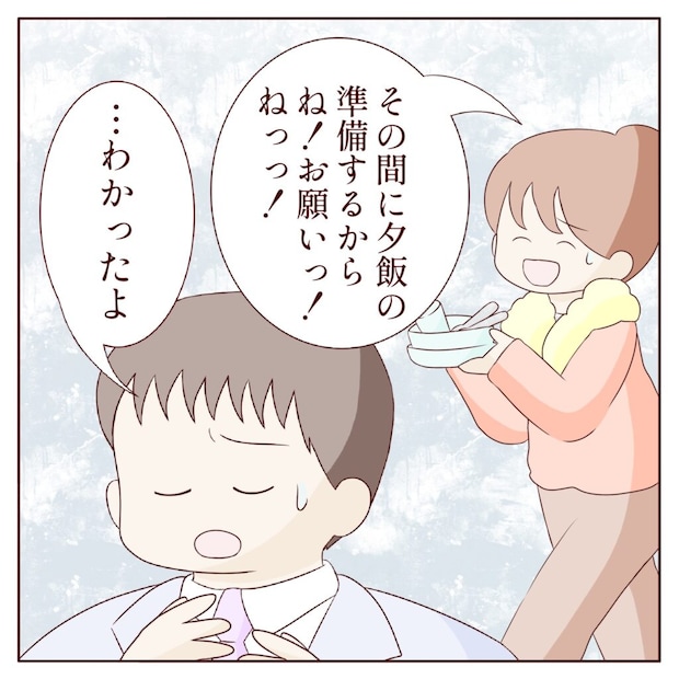 帰宅時間がマサヒコさんよりも少し早いだけなのに家事も育児もほぼ一人で担っているチエミさん。チエミさんが下手に出て何度もお願いすると渋々やってくれるマサヒコさんですが、本当はお願いしなくても率先してやって欲しいですよね。