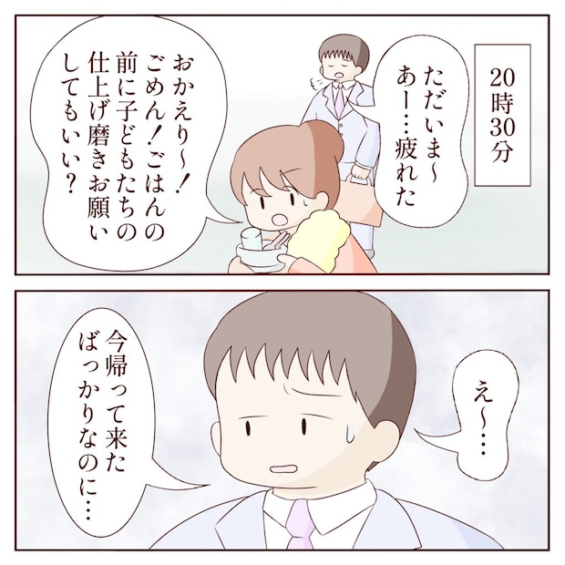 20時30分。「ただいま~。あー・・疲れた」と疲れた様子でマサヒコが帰って来ました。私は夕食の後片付けをしながら「おかえり~!」と声をかけ「ごめん!ごはんの前に子どもたちの仕上げ磨きお願いしてもいい?」とお願いすると、マサヒコは「え~・・。今帰って来たばっかりなのに・・」と露骨に嫌な顔。
