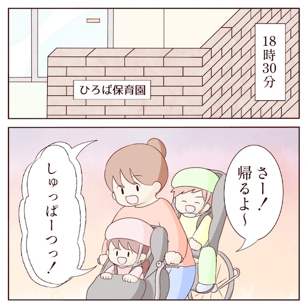夕方18時30分。仕事を終えた私は急いで子ども達を保育園に迎えに行き、家へと急ぎます。二人を自転車の前後に乗せて「さー!帰るよ~」と気合を入れると、「「しゅっぱーつ!」」と声を揃える子ども達。