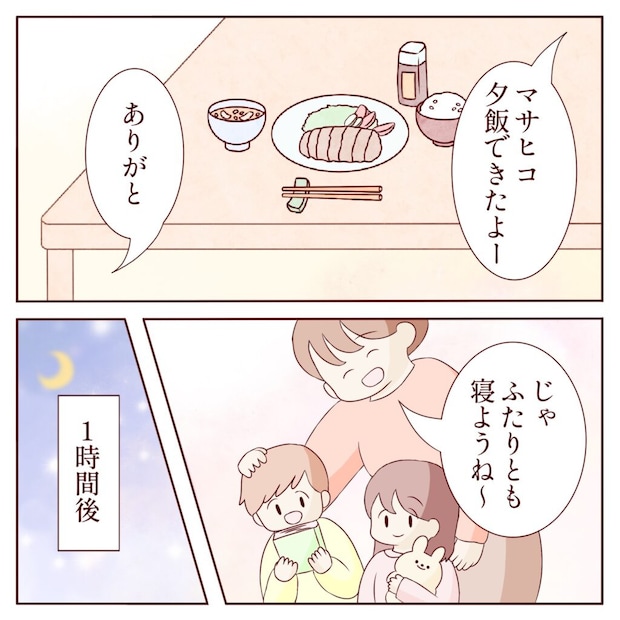 マサヒコが仕上げ磨きをしてくれている間に私は急いでマサヒコの夕飯の準備を終え、「じゃ、ふたりとも寝ようね~」と子ども達と寝室へ。平日の夜はいつもこんな感じでバタバタです。