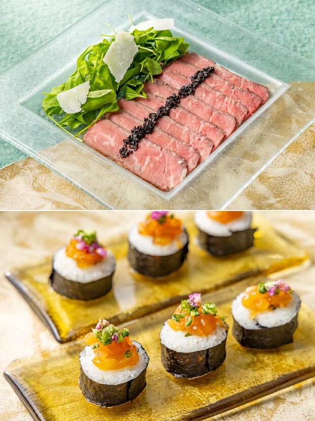 「能登牛のカルパッチョ トリュフバルサミコヴィネグレット ペコリーノロマーノ」は、石川を代表する黒毛和牛を味わうシンプルかつ贅沢な1品。低温でしっとりローストされた能登牛に、トリュフ香るバルサミコ酢ソースが合わせられ、肉の甘みを引き立たせている。