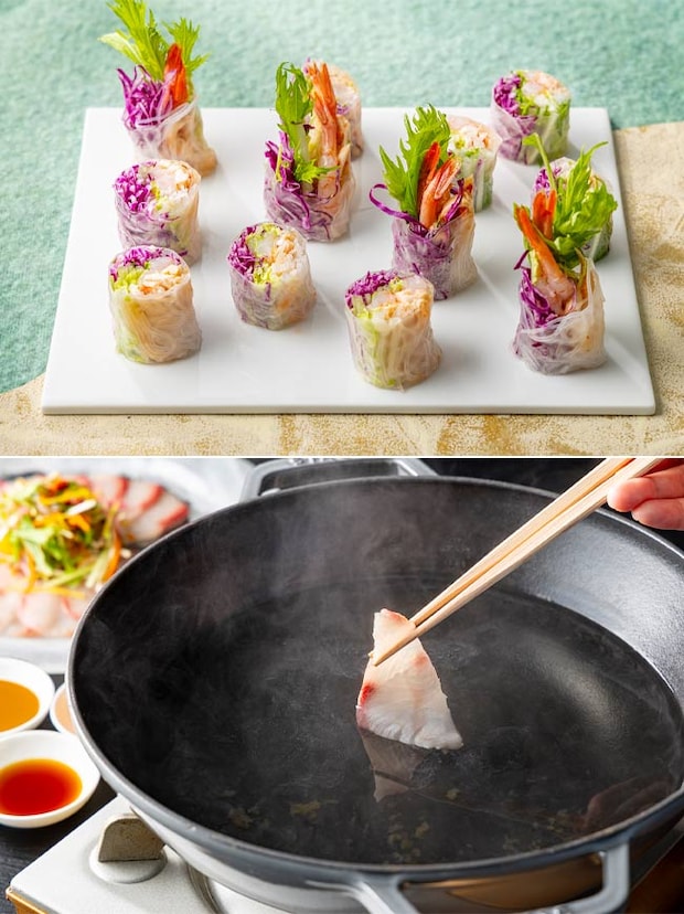 「越の鶏と甘海老の生春巻き もろみ味噌ソース」は、もろみ味噌と合わせた新潟県産越の鶏を、甘エビと白菜と一緒に巻いて、みずみずしくふくよかな味わいに仕上げられている。