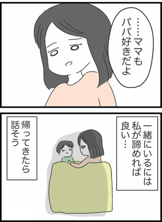 ようことしょうたの口論で目が覚めてしまったのか、息子ゆうたが起きてきました。もう家族3人で暮らすのは諦めたほうがいいのか頭をよぎりますが、何も知らない息子は「パパは?」と聞いてきます。