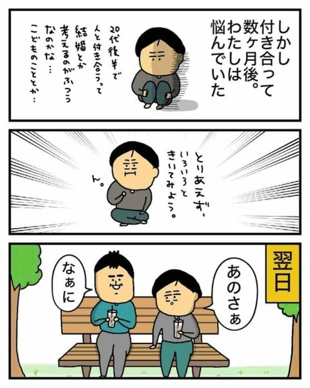 母や友人に背中を押されるようにして、ついにシゲオさんに思いを伝えると、「いろんな生き方があるんだし、絶対こうでなきゃいけないなんてないんだから、一緒にゆっくり考えよう」と優しく受け止めてくれました。