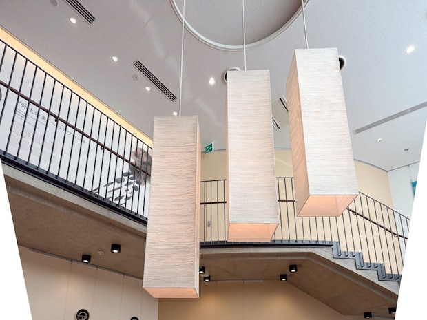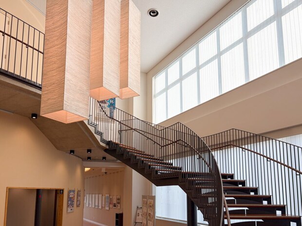 天井からイヤリングのようにぶらさがっているこのランプは青谷で作られている伝統的な因州和紙が用いられています。