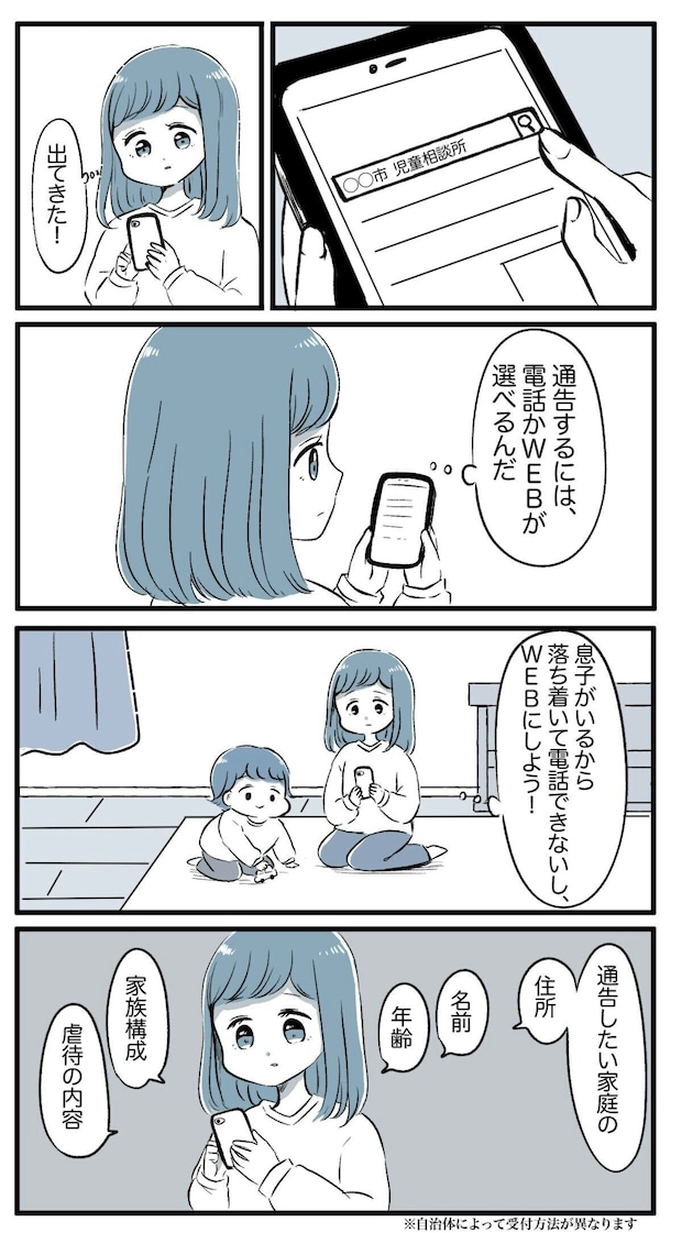 自宅に戻った主人公は、勇気を出して児相に通告。WEBからの匿名通告を行いました。結果、すぐに児相が介入した様子で、中野家にも変化が見られたそうです。