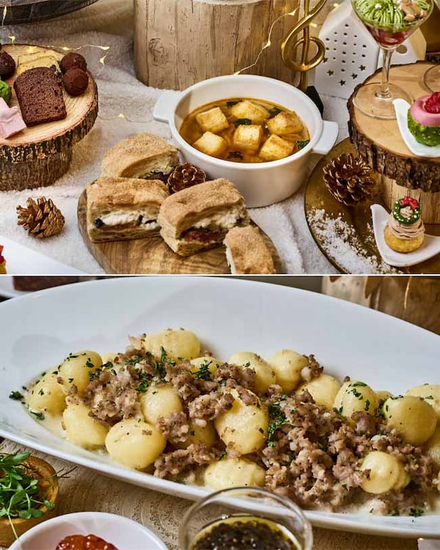 香ばしい焼き色のローストチキンに、ポルチーニ茸の香りとパルメザンチーズのコクが豊かなソースを合わせた「ローストチキン ポルチーニとパルメザンのクリーミーソース」や、魚介のうまみが凝縮したトマトソースと合わせた「魚介のトマトソース トロットレパスタ」など、クリスマスならではの10種の品々を好きなだけ召し上がれ。