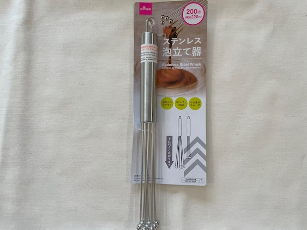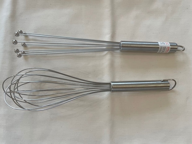 こうして並べてみると、ダイソーのステンレス泡立て器がコンパクトなのが分かりますね。