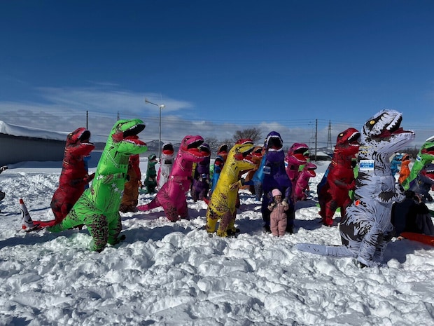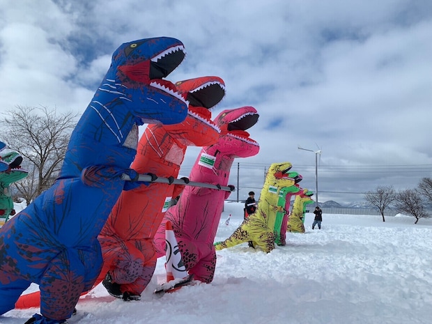 今年も開催!巨大なティラノサウルスの着ぐるみを着て雪上を駆け抜ける「ティラノサウルス雪中レース!」。