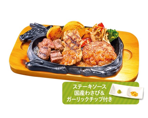サーロインと手ごねハンバーグ、グリルチキンをセットした商品。
