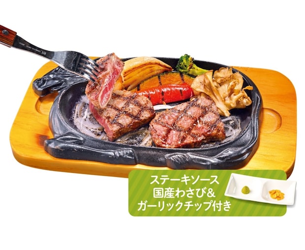 赤身と脂身のバランスが取れた黒毛和牛のサーロインを300℃の高温直火で焼き上げ、かぼちゃ、舞茸、玉ねぎ、赤パプリカ、じゃがいも、ブロッコリーといった全6種の野菜をグリルして盛り合わせたもの。粗切りの国産わさび、ガーリックチップ付き。「冬のご馳走商品」として展開する。