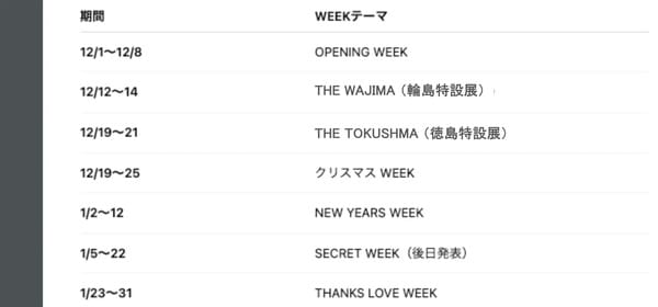 また、今後「MONOKATARI EXPO 2025」では、12月1日(月)より2カ月間にわたり、「OPENING WEEK」「THE WAJIMA(輪島特設展)」「THE TOKUSHIMA(徳島特設展)」「クリスマスWEEK」「NEW YEARS WEEK」「SECRET WEEK(後日発表)」「THANKS LOVE WEEK」を開催。