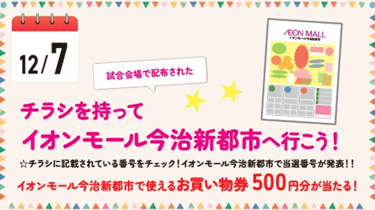 7日はGAME PARTNERのイオンモール今治新都市と連携。今治市営中央体育館の試合会場で配布されたチラシを持ってイオンモール今治新都市へ行くと、お買い物券500円分が当たる抽選会に参加できます!