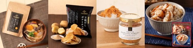 久世福商店「粉末万能だし」「万能だしポテトチップス」「大人のしゃけしゃけめんたい」「混ぜご飯の素 味わい豊かな四種のきのこ」