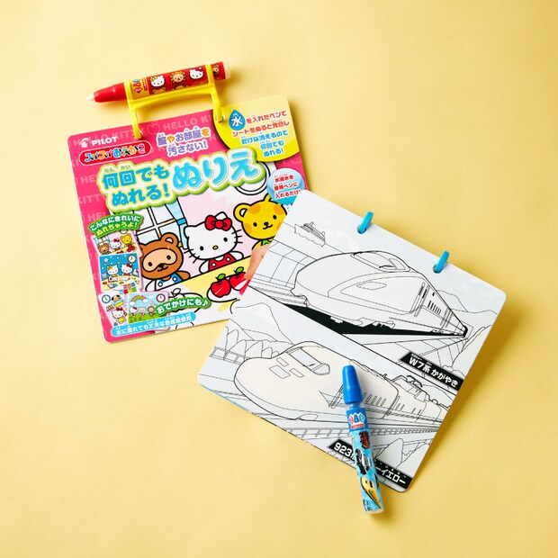 何回でもぬれる!ぬりえ(左から)ハローキティ、実写版はたらくのりもの各¥990/パイロット © 1976, 1996, 2012, 2019 SANRIO CO., LTD. APPROVAL NO.S 604001 「JR西日本商品化許諾済」