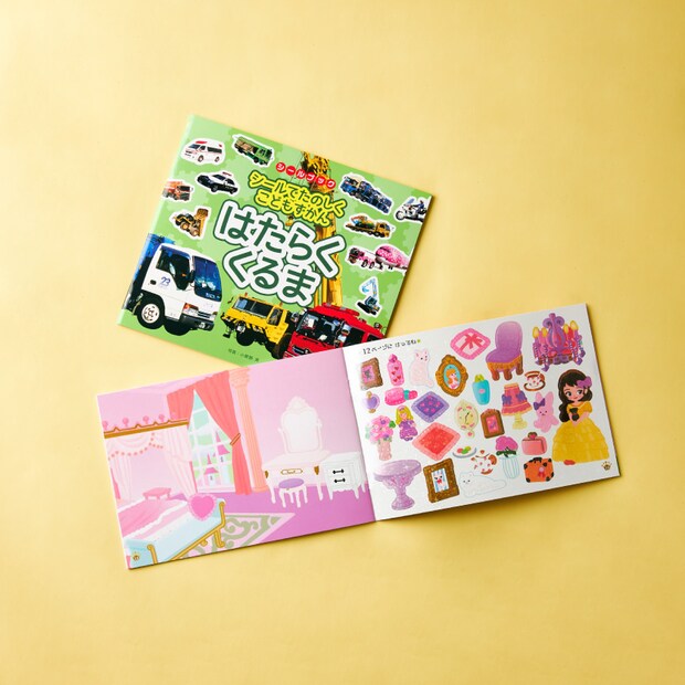 キッズに人気の「はたらくくるま」を集めたシールブックは、バスやタクシーなど街で走る車や工事現場で活躍する車のシールをワイドな台紙に自由に貼って遊べる。プリンセスの世界観が楽しめるシールブックは、ドレスやティアラをおしゃれにコーディネートしたり、ぬりえやクイズを楽しんだり、遊び方もいろいろ。