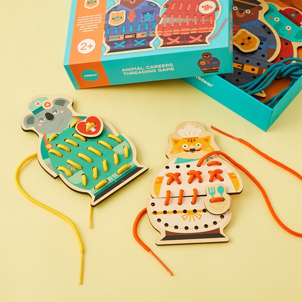 アニマル型のプレートにひもを通して遊ぶオモチャ。それぞれの動物にぴったりなお仕事バッチがあるので、ひもで上手につけてあげよう! ひもとおしに必要な指先の器用さは、日常の中でも必要なスキルのひとつ。遊びながら子どもたちの指先や脳を刺激して、成長を促すことができる。