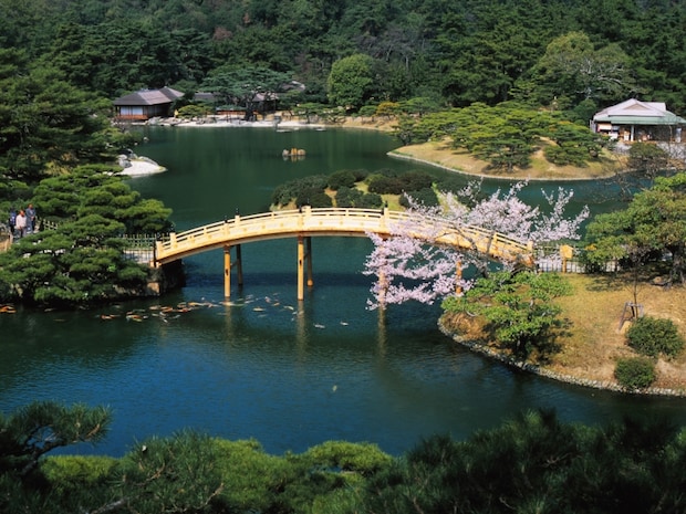 国の特別名勝に指定された回遊式大名庭園で広さは約75haと国内最大規模を誇ります。「一歩一景」と称されるほど見どころが多く、高松市を代表する観光スポットとなっています。木々や石の配置などの地割と石組が評価された庭園は「木石の雅趣(もくせきのぐしゅ)」と呼ばれ、日本三名園を凌ぐとも言われています。