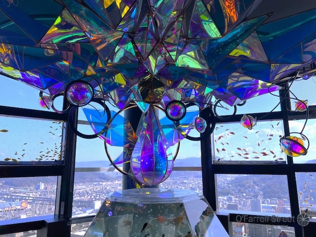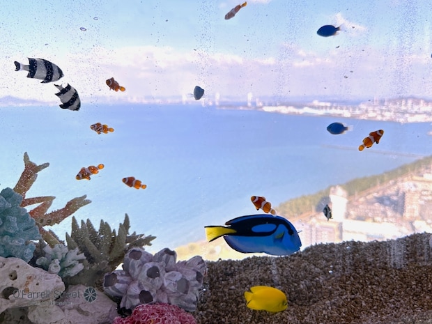 万華鏡のようにきらめく光の反射と金魚や熱帯魚たちが大小様々な水槽の中で泳いでいます。ビルから見える海や島々、町並みをバックに優雅に泳いでいる演出は、不思議な癒し空間です。