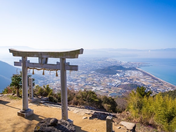 「天空の鳥居」と呼ばれて人気の高屋神社。標高404mの稲積山の頂上に建てられている鳥居です。眼下には観音寺市内と瀬戸内海の美しい景色が広がります。四国八十八景にも選出されています。