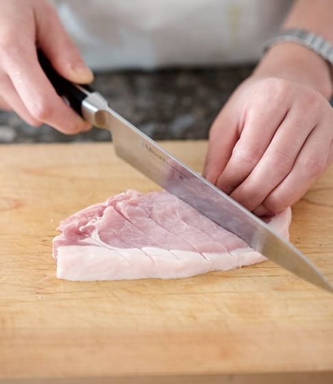 ① 豚肉は両面に1㎝間隔で切り込みを入れ、2㎝幅に切る。ボウルに入れてAをもみ込み、10分おく。