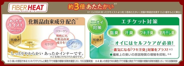 そのラインナップにあるFIBER HEAT SUPER PREMIUM「あったかモイスト」インナーは、従来のCLOSSHI FIBER HEAT「あったかモイスト」に比べて約3倍の保温性を備えています。ウール入りで非常に寒い日や屋外での長時間滞在に適しているだけでなく、保湿性の高い繊維と環境に優しいレーヨンを使用することで、しっとりとした柔らかな着心地も実現しています。