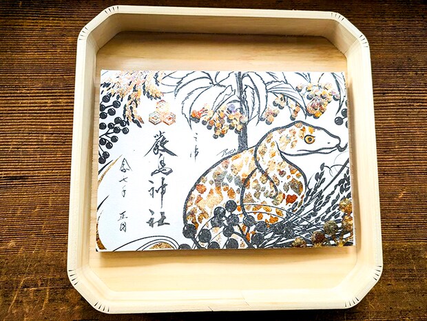 大洲和紙に描かれた干支の絵が金属箔で彩られ、とても魅力的な全国でも珍しい御朱印です。