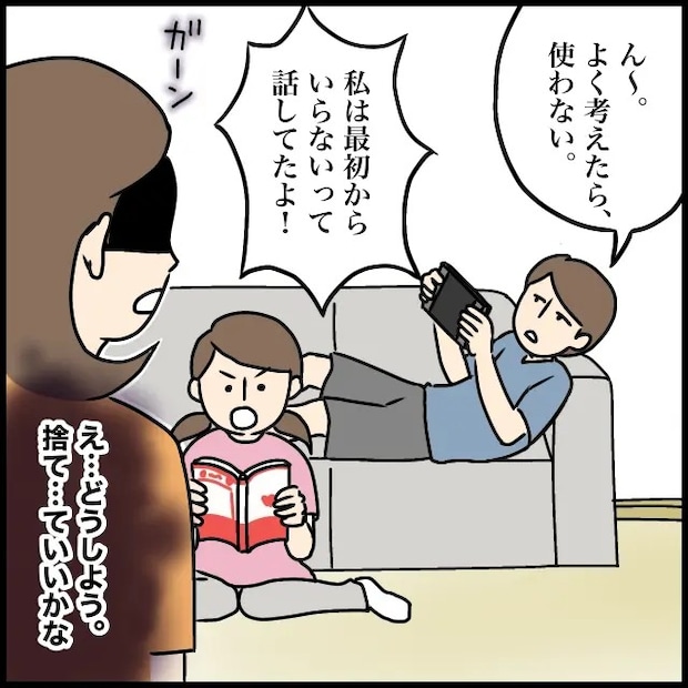 ヒロムはゲームの画面から目を離さずに「ん~よく考えたら使わない」とぽつり。続けてツキも「私は最初からいらないって言ったよ!」と言いました。その言葉を聞いた私はガーンと放心状態。「どうしよう、捨ててもいいかな・・・」と心の中でつぶやきました。