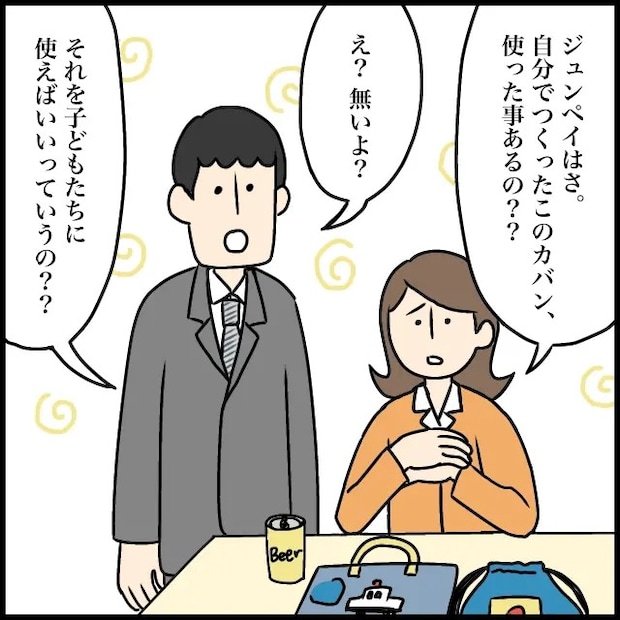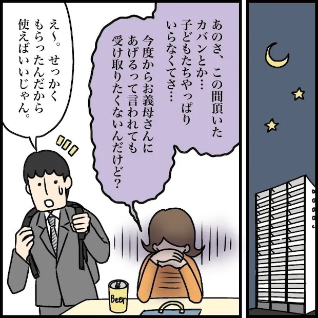 その日の夜、私は仕事から帰ってきたジュンペイに、子どもたちがカバンをいらないと言っていたことを伝えたうえで、「今度からお義母さんにあげるって言われても受け取りたくないんだけど」と相談しました。しかしジュンペイは、「え~、せっかくもらったんだから使えばいいじゃん」とあっさり言います。