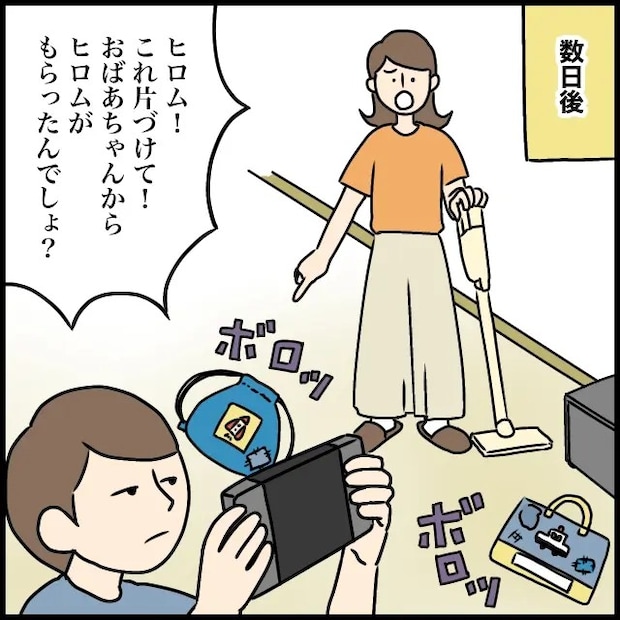 それから数日後、リビングを掃除していると、義母からもらったお古のカバンが床に散らばっていました。私はゲームに夢中になっているヒロムに、「ヒロムこれ片付けて!おばあちゃんから貰ったんでしょ?」と声をかけます。