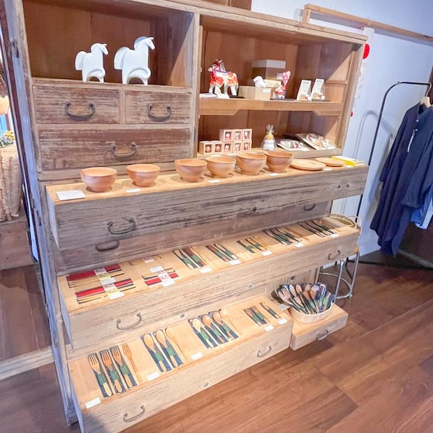 古くから継承されてきた道具や民芸品など、代表の塩川さんが「イイナ」と思えるモノばかりを集め展示販売されているそうです。