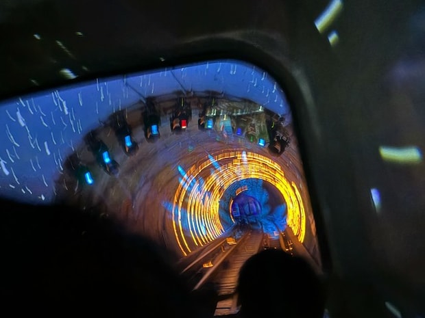 そして、乗り物に乗ると、光と音の演出と共にかなりのスピードで暗闇の中を進み、あっという間に到着!
