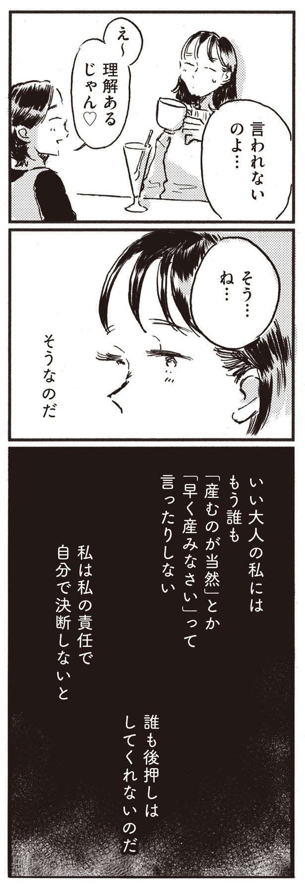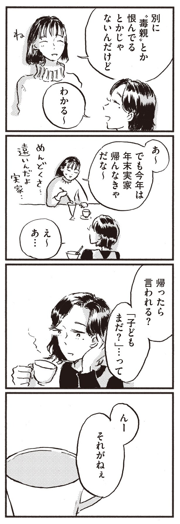 2025年12月3日 【漫画】「私は…来世でいっかなぁ」子どもを持つ以外の形で“幸せ”を見つけた友人/子どもが欲しいかわかりません(20) WEBザテレビジョン フリーライターのカナコは、マッチングアプリで出会ったリョウと結婚して5年目。今まで心から「子どもが欲しい」と思ったことは無かったが、「高齢出産」と呼ばれる年齢に差し掛かったことで、気持ちと向き合うことに。友人や家族、夫との会話を通して、カナコは「自分にとっての幸せ」について考えていく…。 子どもの有無を手がかりに様々な幸せと出会っていくコミックエッセイ、「子どもが欲しいかわかりません」(著・大町テラス)から、全23回連載でお届け。今回は第20回となる。