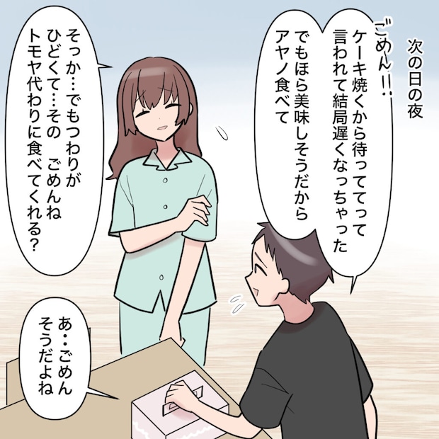 「ごめん!ケーキ焼くから待っててって言われて、結局遅くなっちゃった。でも、ほら美味しそうだから、アヤノ食べて」そう言って、ケーキを差し出すトモヤに、「そっか・・でもつわりがひどくて・・。その、ごめんね。トモヤ代わりに食べてくれる?」そう言うと、「あ・・ごめん。そうだよね」とトモヤが申し訳なさそうに言いました。