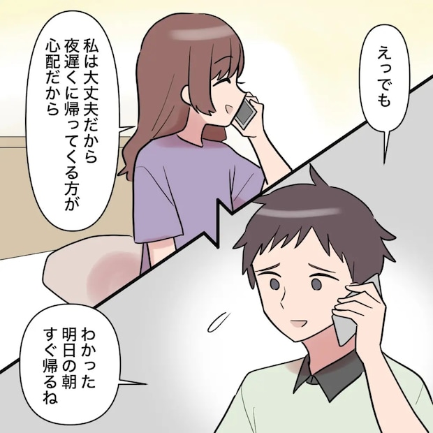 「えっ、でも・・」と躊躇するトモヤに、「私は大丈夫だから。夜遅くに帰ってくる方が心配だから」と言うと、「わかった。明日の朝すぐ帰るね」とトモヤが言いました。