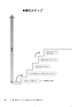「○○がしたい」を階段式に積み重ねることで、最終的には大きな夢の実現につながるという「夢実現理論」を同書で伝えている。